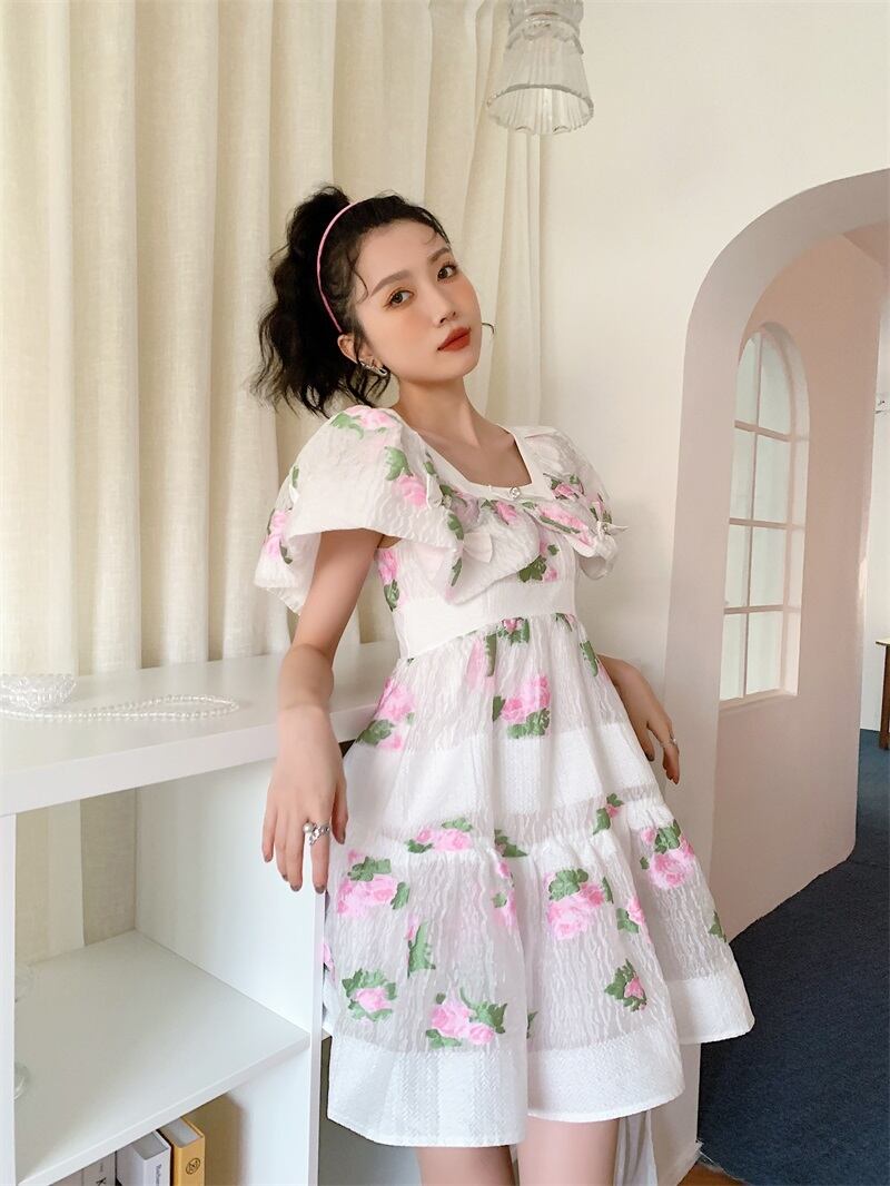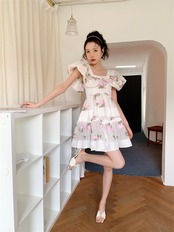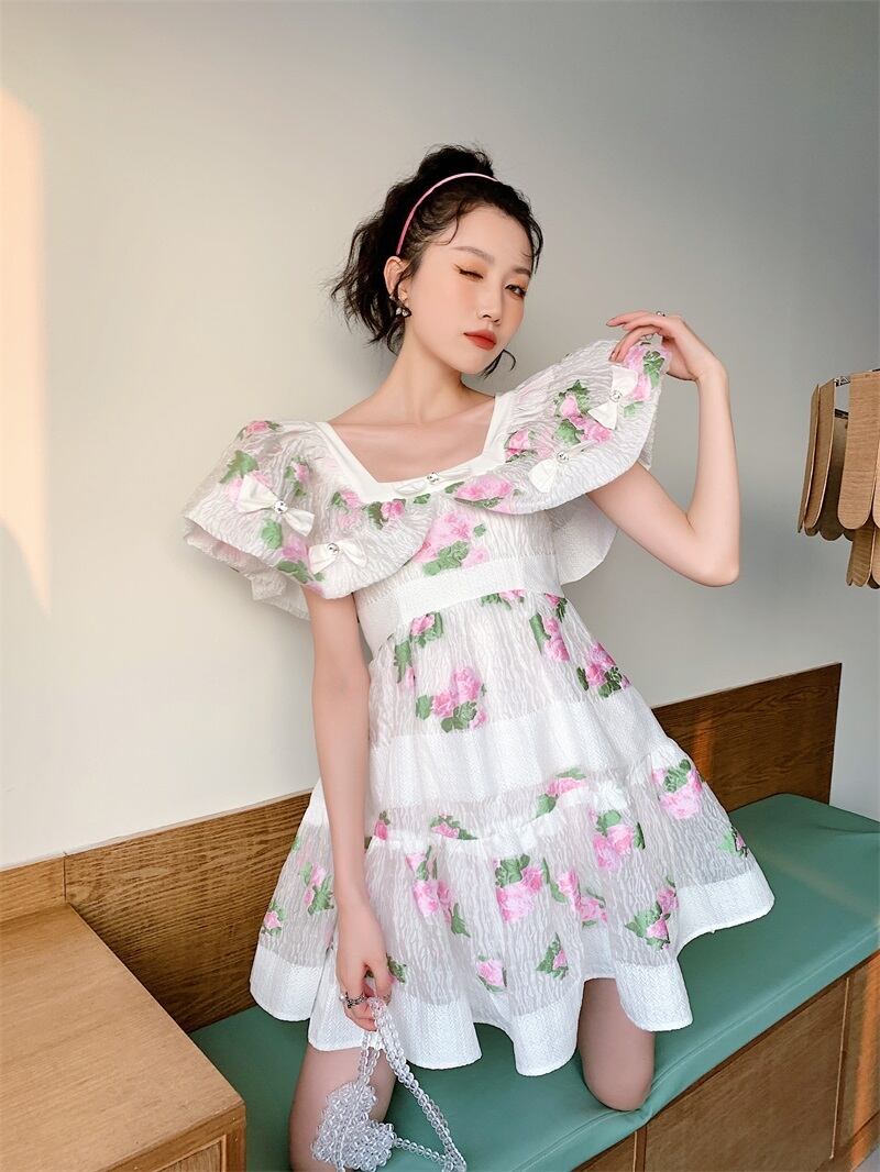 ハイウェストウェストFlowerデザイン ワンピース薄手ショートスカート 大人ガーリー スウィート キュート カジュアル フラワーデザイン スクウェア ウエスト GroundMODE221320691374 | pleglad Ground