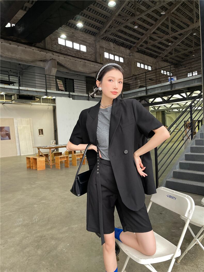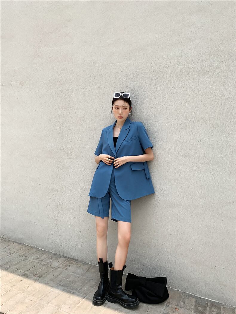 色:ブラウントップスポット,ブラウンショーツスポット,ブルートップスポット,ブルーショートパンツ,黒いシャツ,黒のショートパンツ