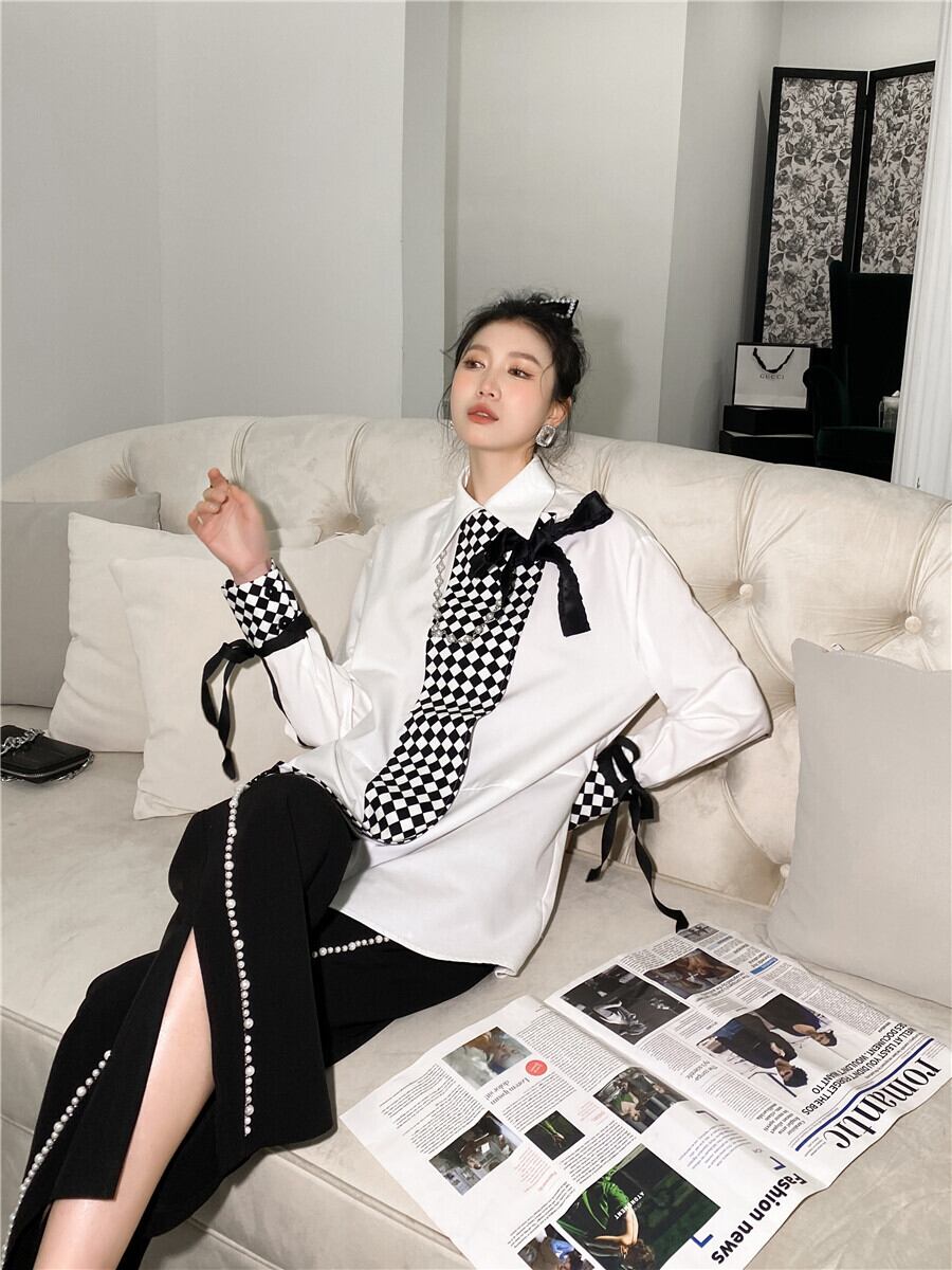 色:黒いズボン,白のシャツ