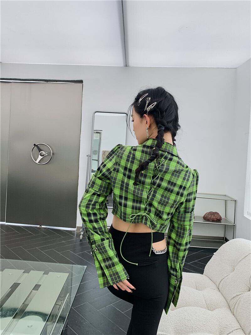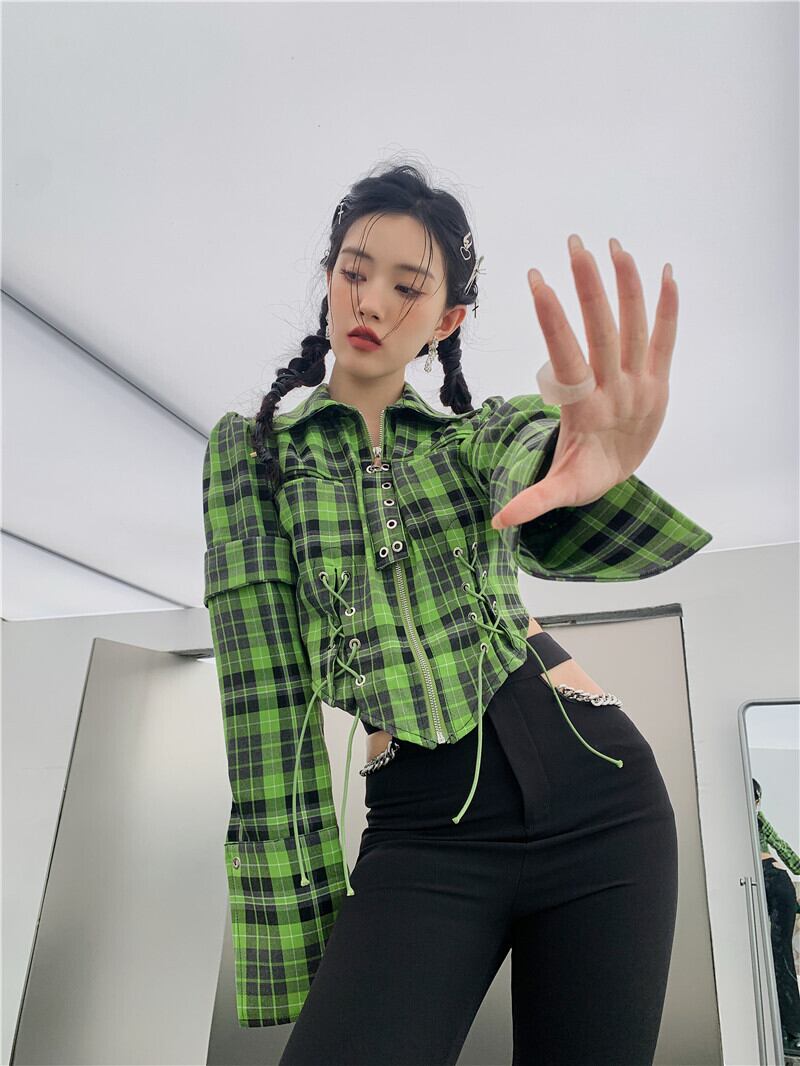 色:緑のシャツ,ブラックチェーンプルアップパンツ