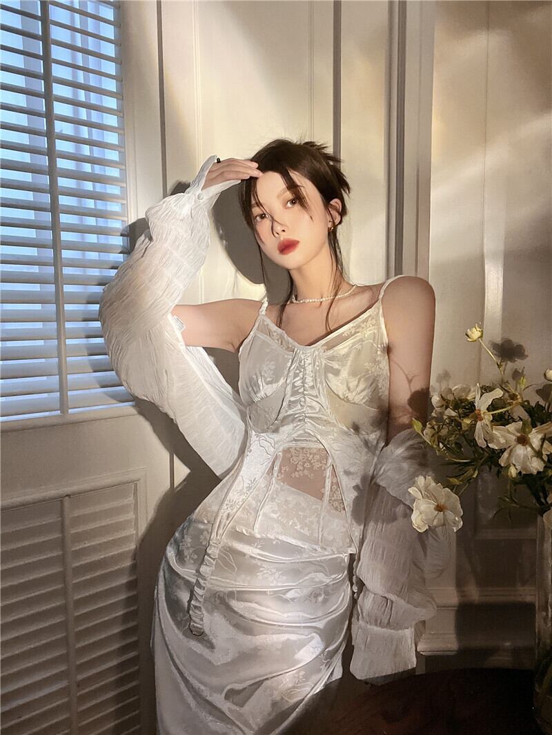 色:白いショール,ホワイトサテンストラップ,赤い格子縞のスリング,白いスカート,黒スカート