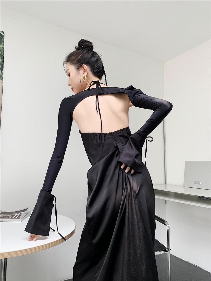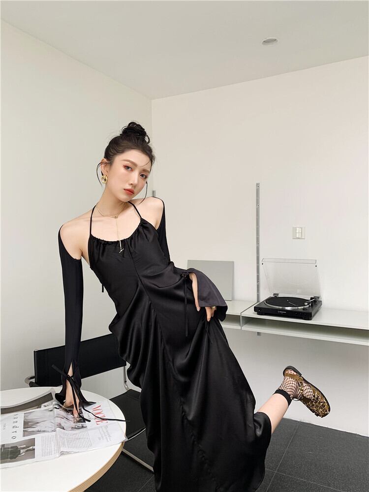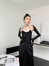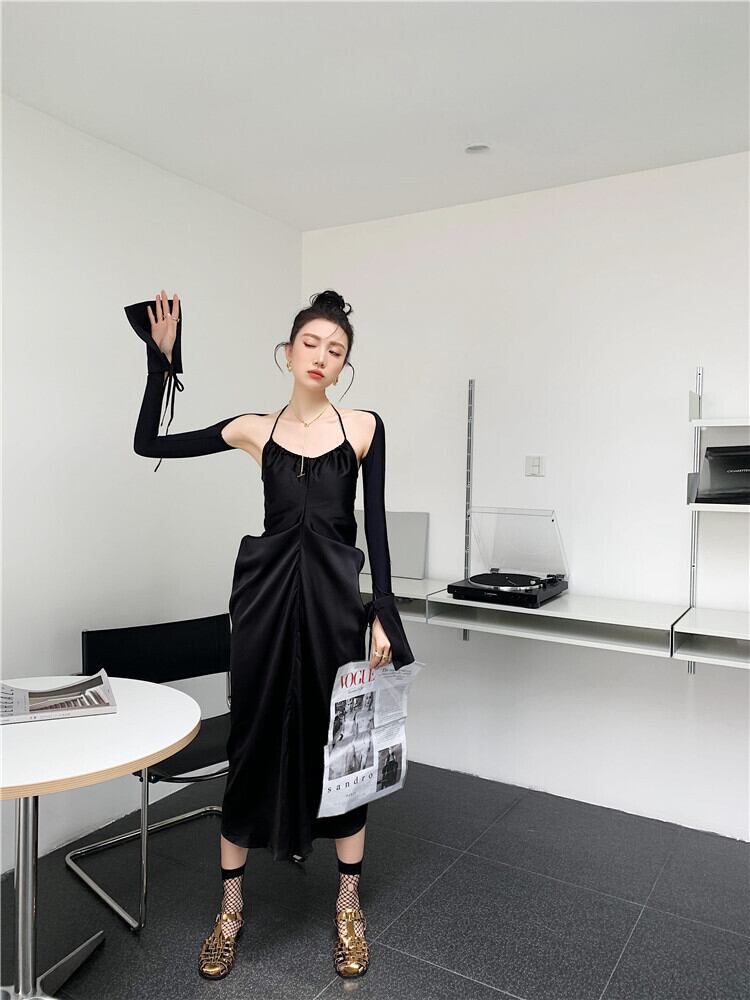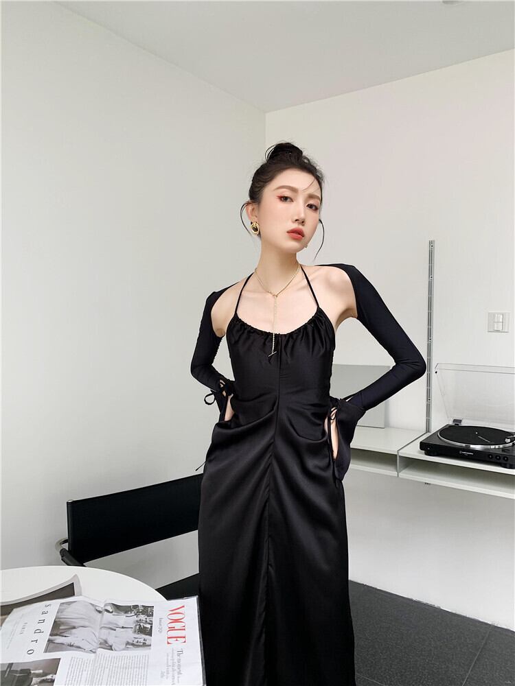 色:グレーのドレス,黒,黒のテザースリーブ,灰色のUV日焼け防止服