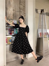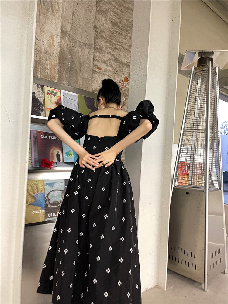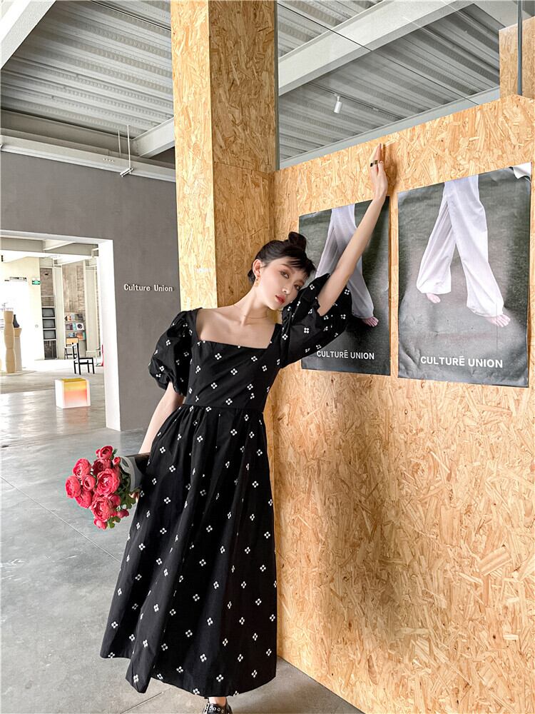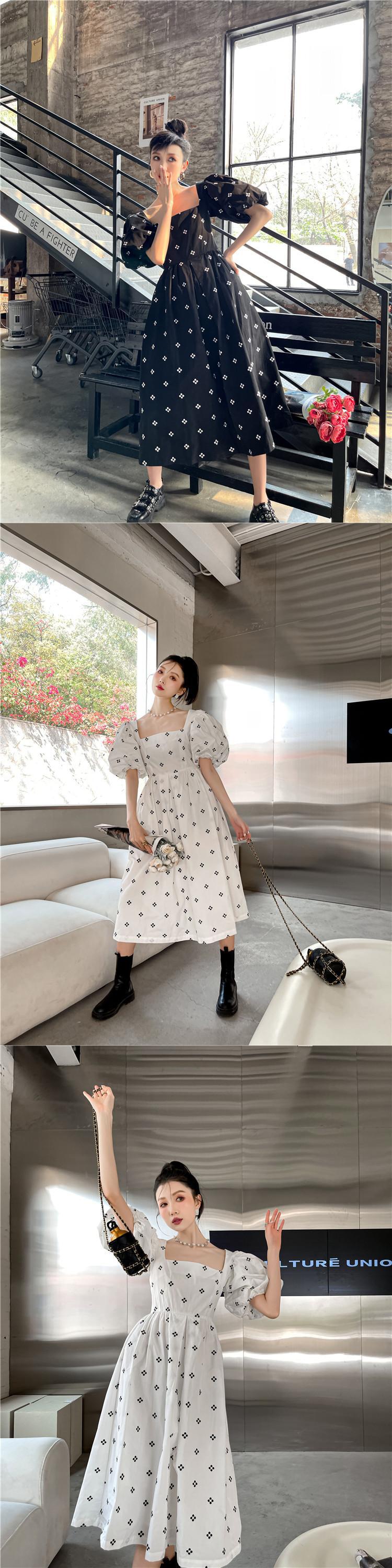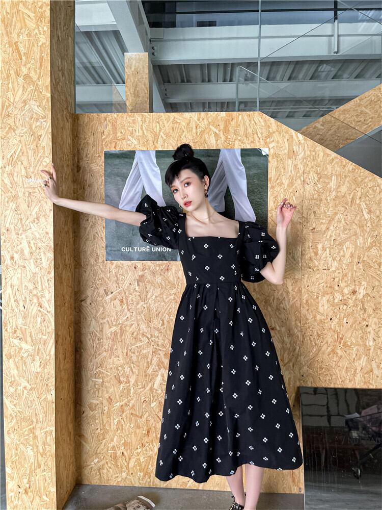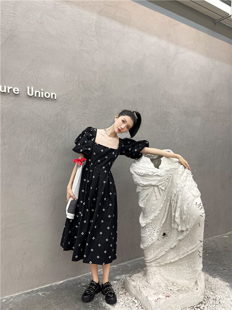 Flowerデザイン 刺繍スタンダードロングスカート ワンピース ランタンスリーブ レトロ フラワーデザイン スクウェア パフスリーブ GroundMODE299594603202 | pleglad Ground