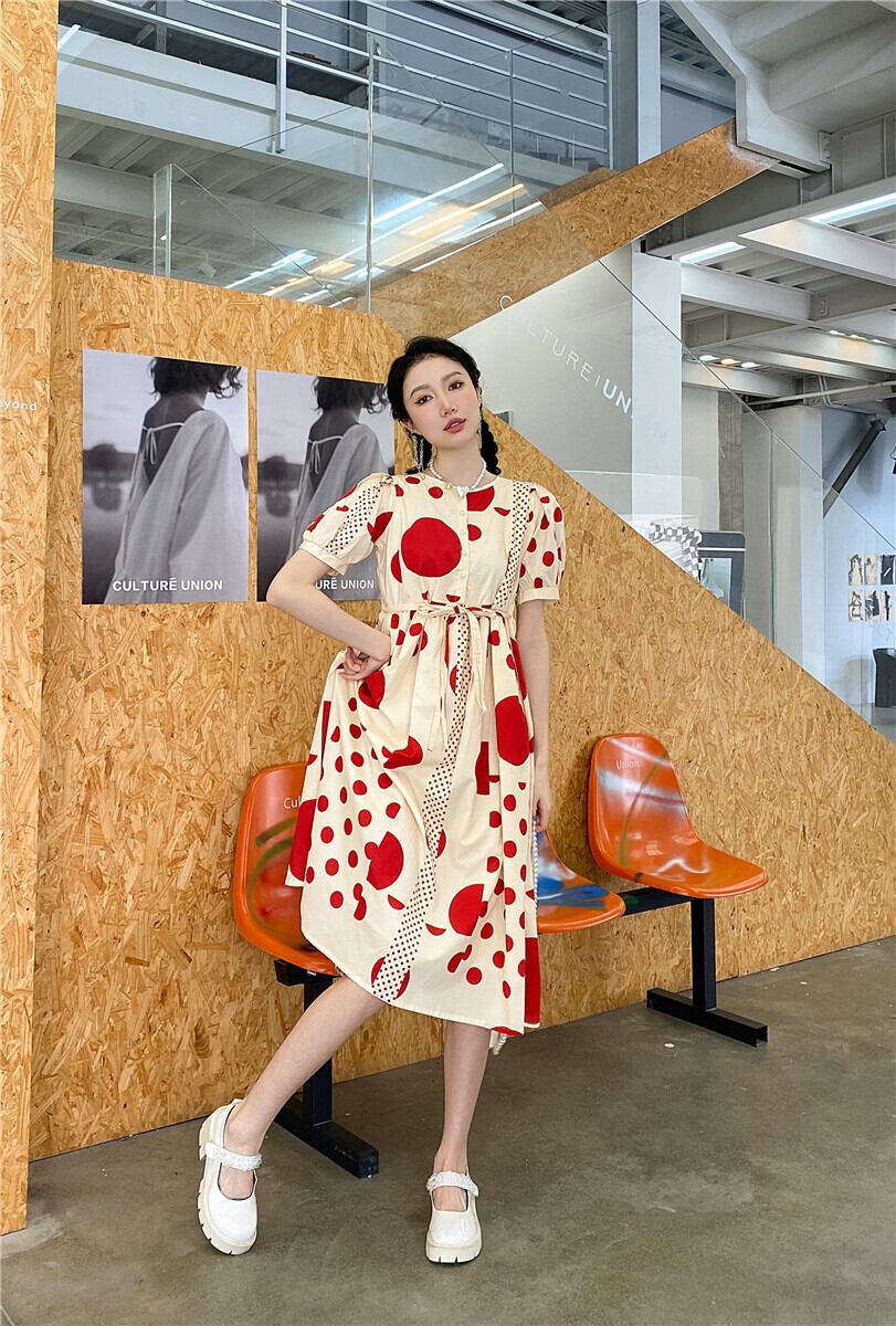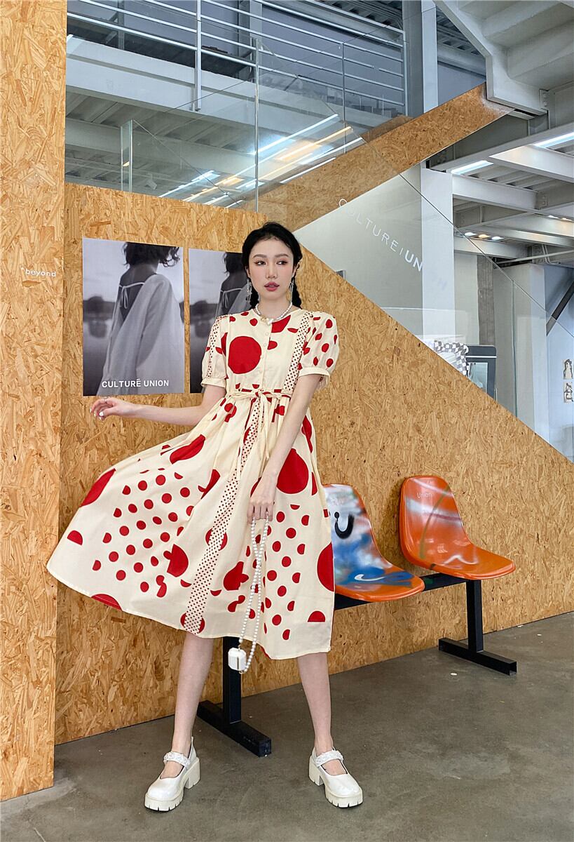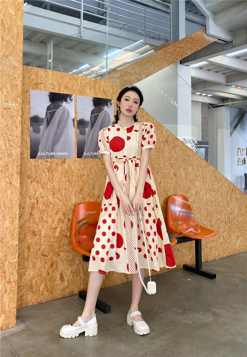 レッド水玉ウェストワンピースレディース夏服ラウンドネックスリーブスカート 大人ガーリー スウィート キュート カジュアル 夏物 Oネック ウエスト GroundMODE285351082940 | pleglad Ground