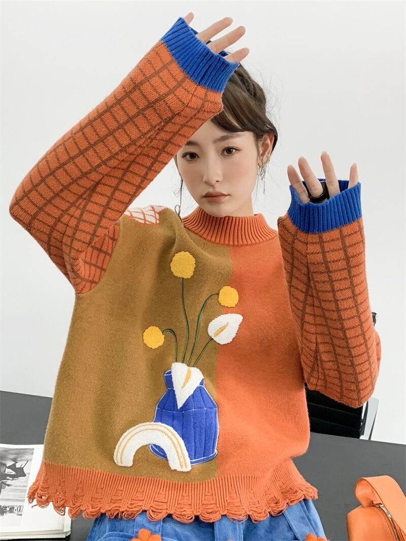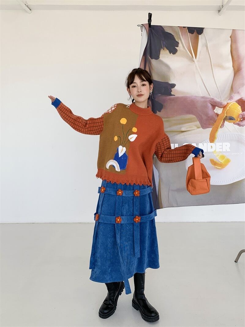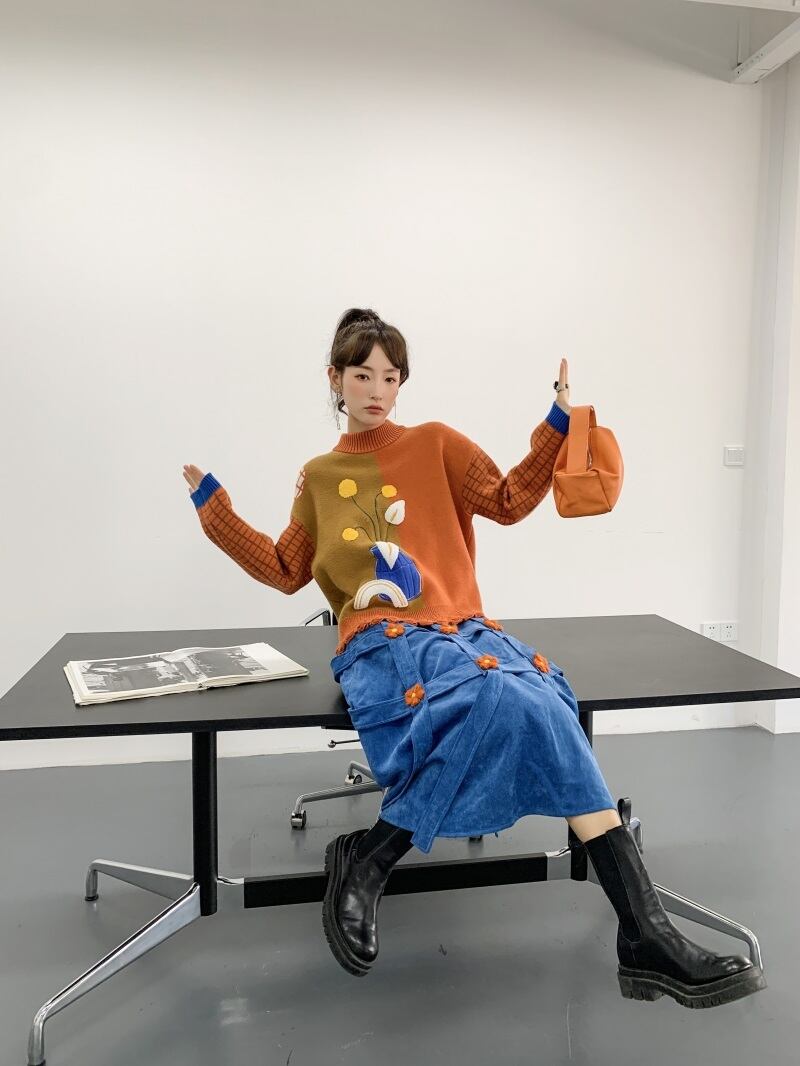 色:カラフルな青いスカート,キャラメルカラーブロックセーター
