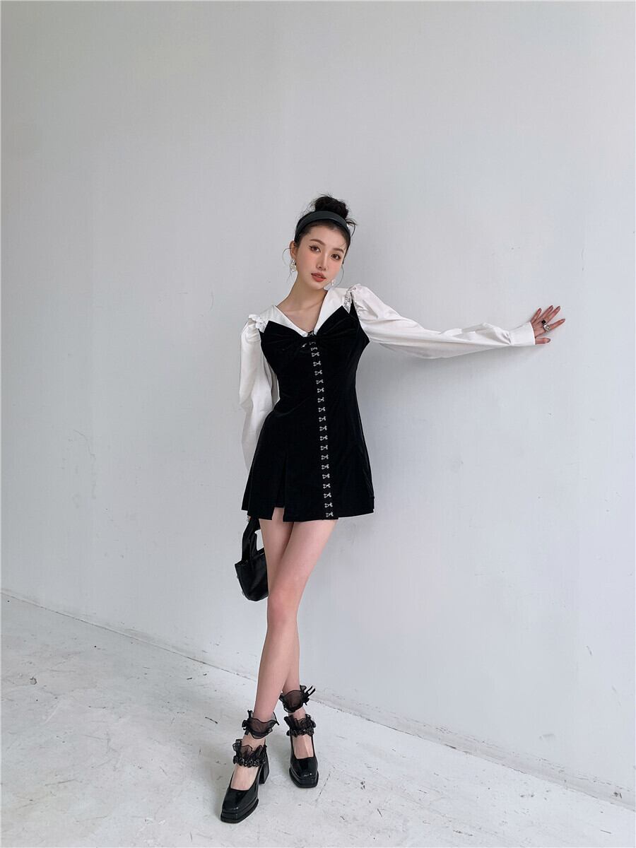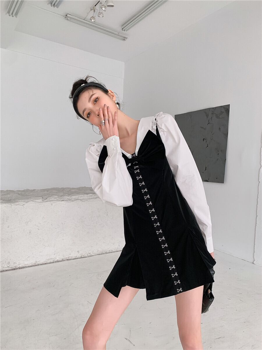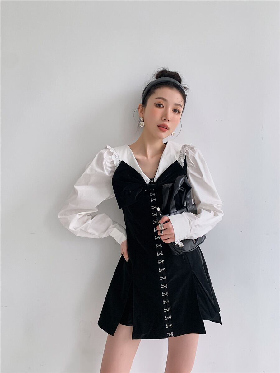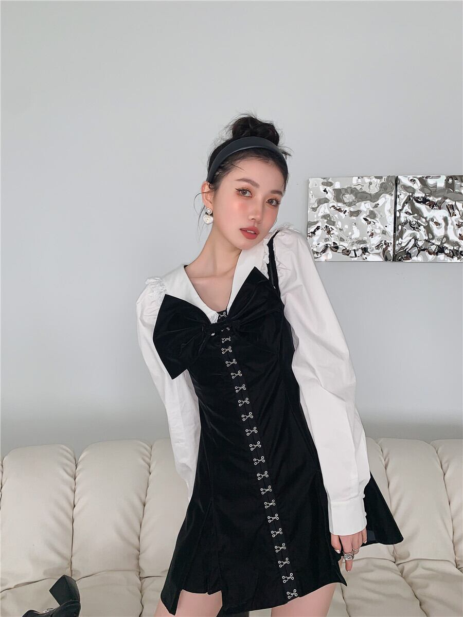 ブラックホワイトスタイルシャツ ワンピース長袖スリーブ ロング 大人ガーリー スウィート キュート カジュアル ステッチ GroundMODE257484427105 | pleglad Ground