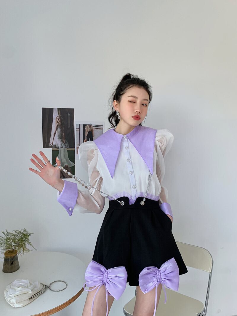 色:白と紫のシャツスポット,チェーン+オーバーオールスポット