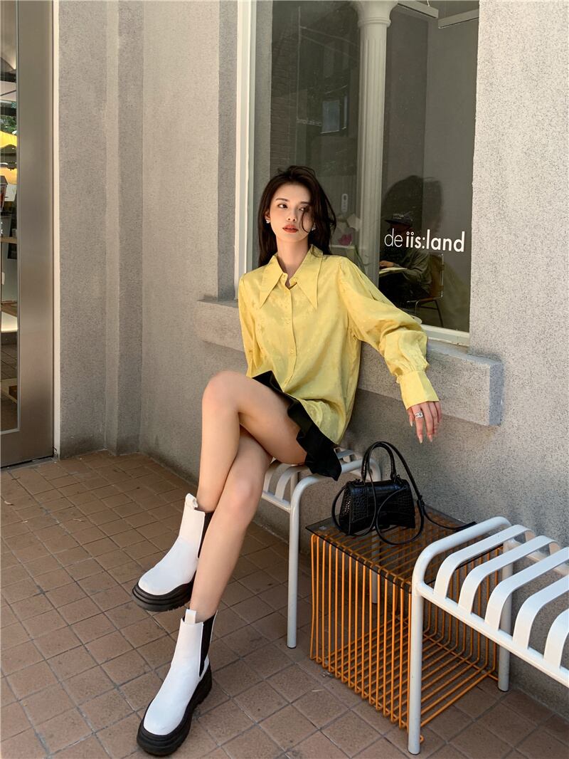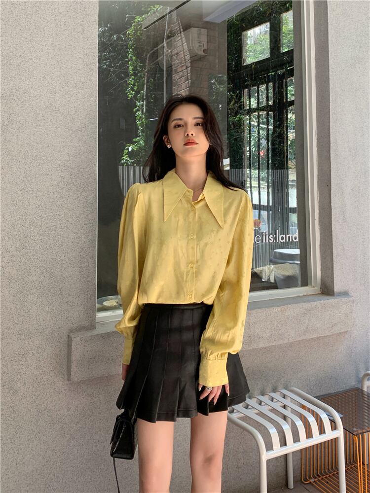 シフォンジャカードカラーグリーンシャツ スプリングイエロー ロング 大人ガーリー スウィート キュート カジュアル 春物 長袖 GroundMODE293429166368 | pleglad Ground