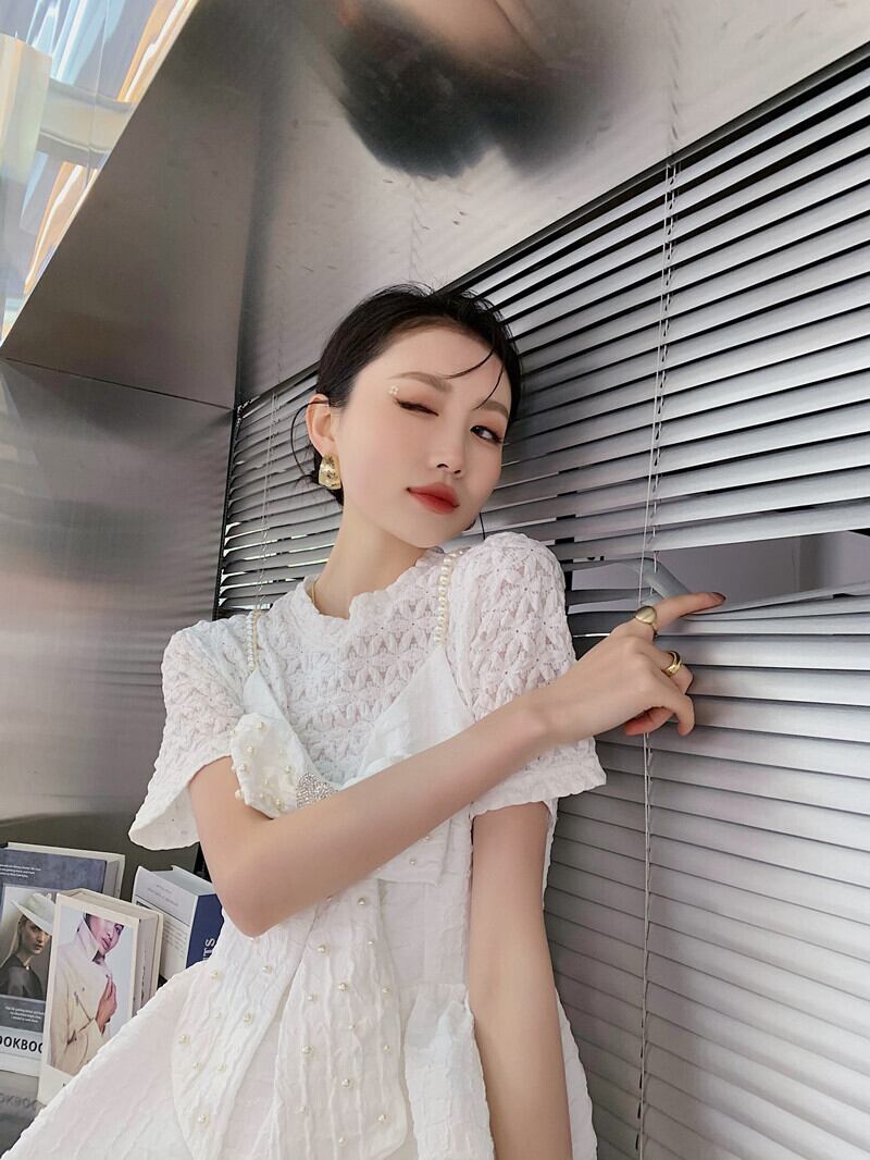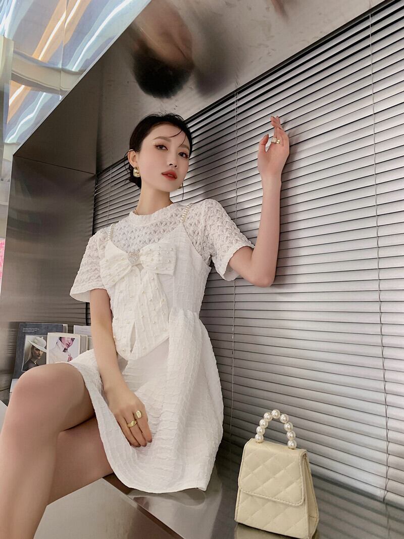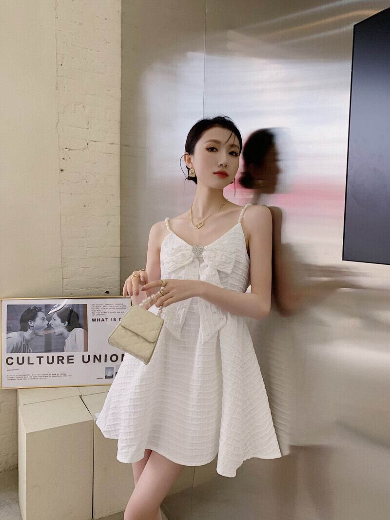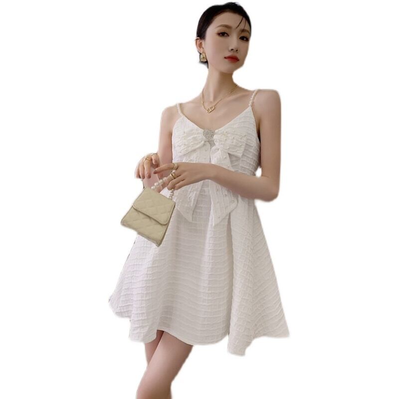 色:白い半袖,パールバタフライサスペンダースカートスポット
