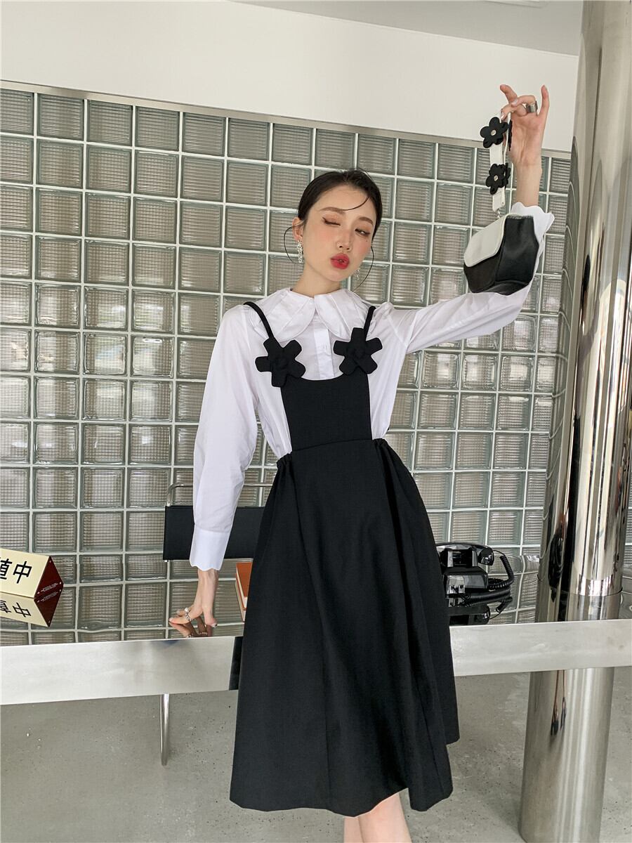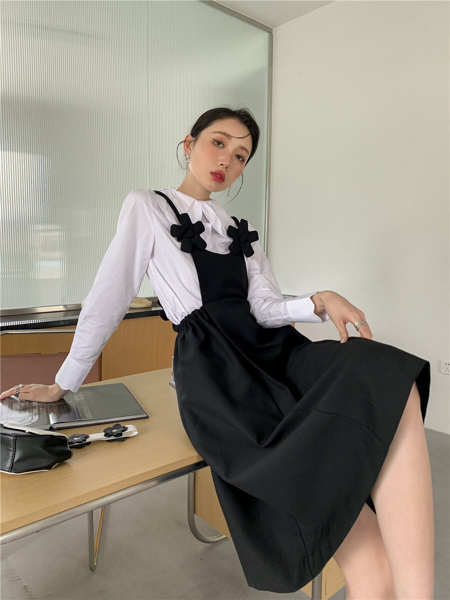 色:グレーのドレス,ブラックサスペンダースカート,シャツ