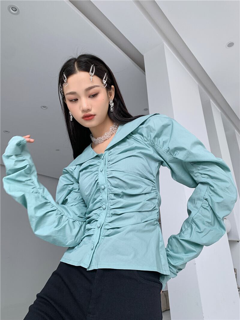 秋物カーディガントップス プリーツショートシャツ レディース ロング ブルー 大人ガーリー スウィート キュート カジュアル オータム グリーン 長袖 GroundMODE217667470034 | pleglad Ground