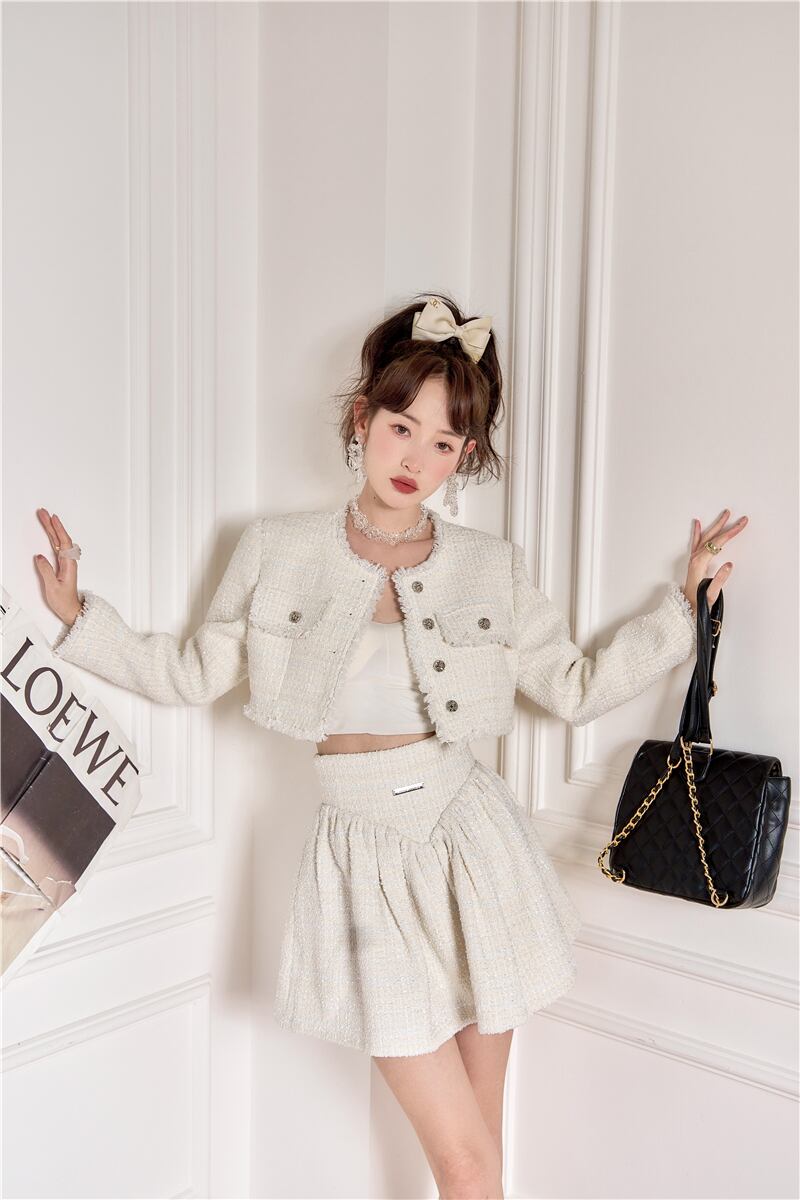 色:乳白色のショートコート,クリームチュニックスカート,ブラックショートコート,黒のチュニックスカート