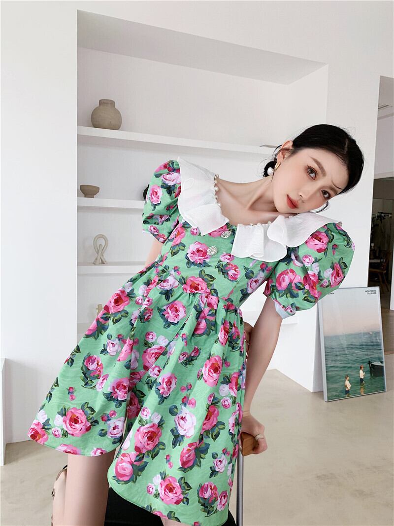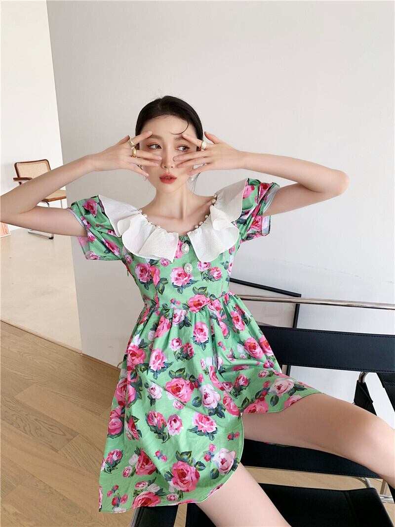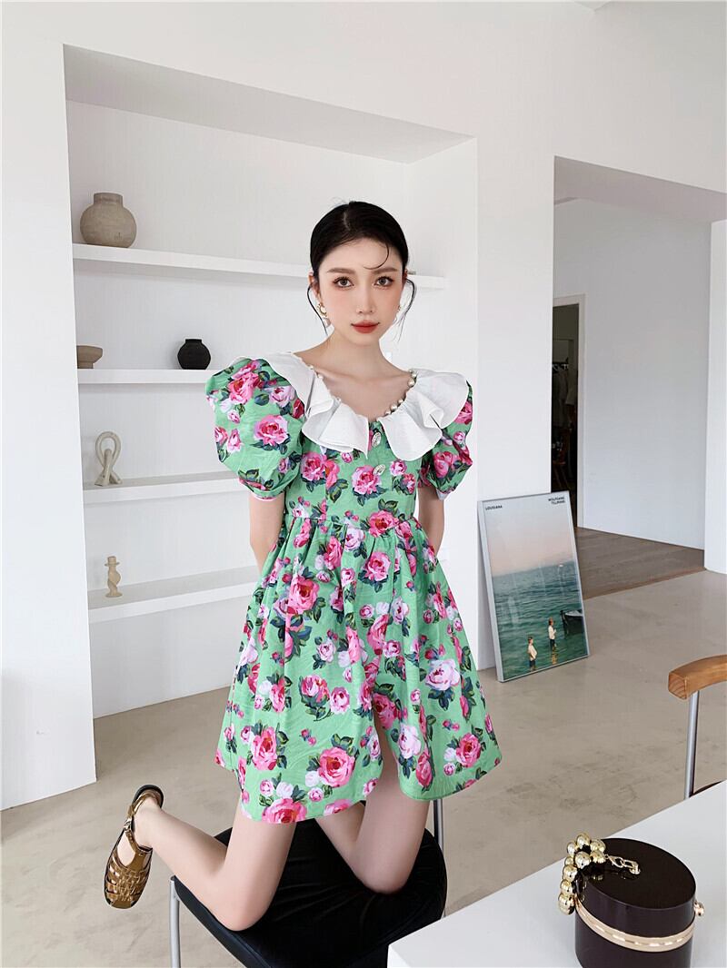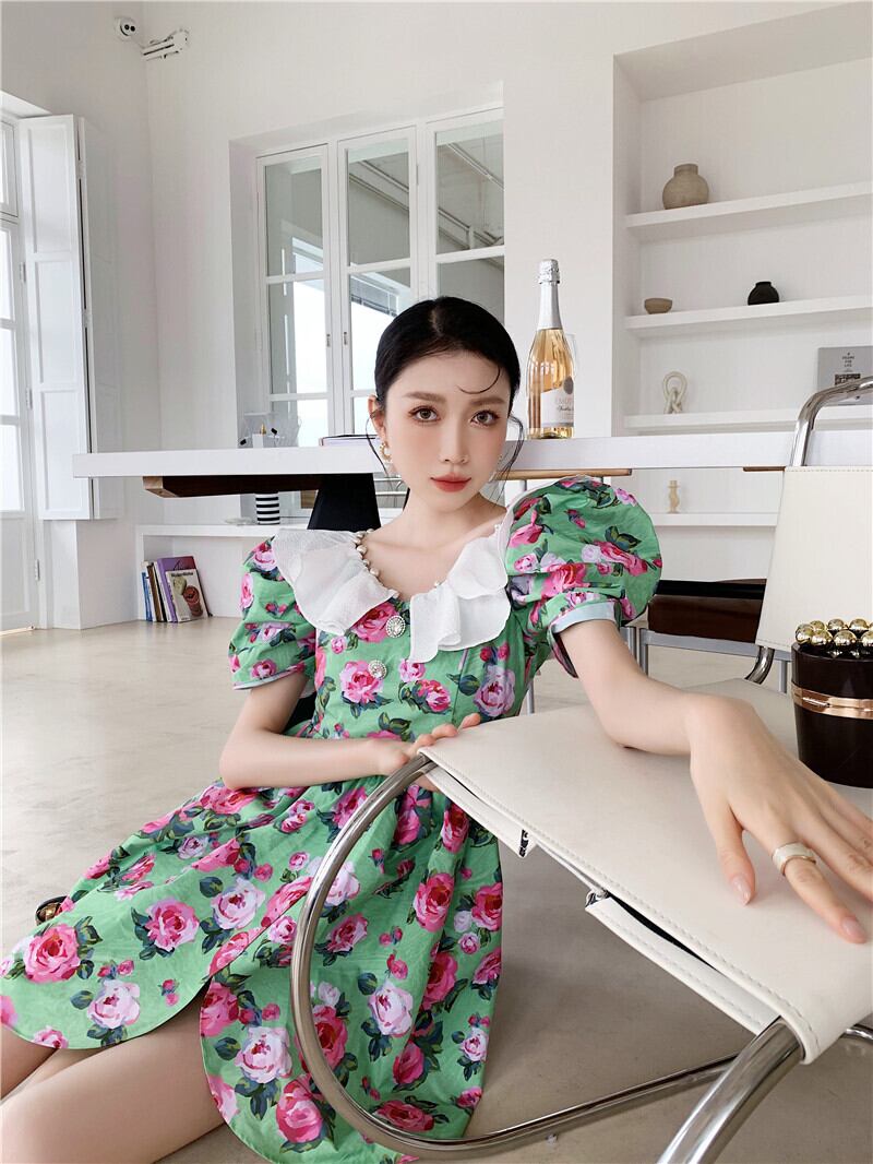 スプリング夏服グリーンルーズミニ ワンピースワンピースFlowerデザイン スカート フローラル 大人ガーリー スウィート キュート カジュアル 春物 夏物 花柄 フラワーデザイン GroundMODE284517062360 | pleglad Ground