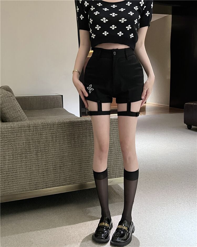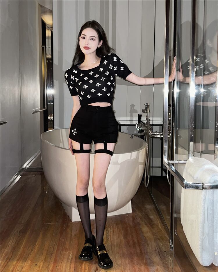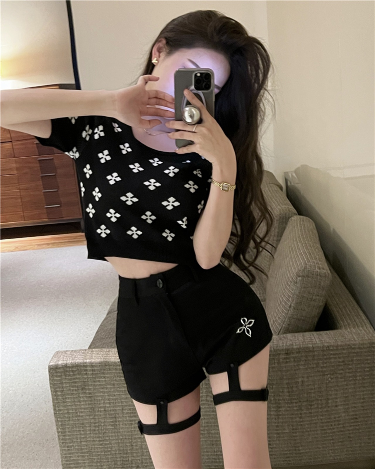 ブラックスタンダードショートニットセーター クロスFlowerデザイン ショーツ レトロ 大人ガーリー スウィート キュート カジュアル フラワーデザイン GroundMODE261824057465 | pleglad Ground
