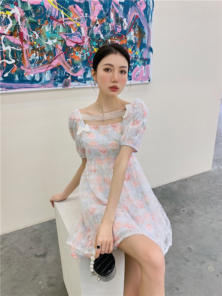 ワンピース夏服ウェスト薄手フローラルスリーブショートスカート 大人ガーリー スウィート キュート カジュアル 夏物 花柄 ウエスト GroundMODE236960895835 | pleglad Ground