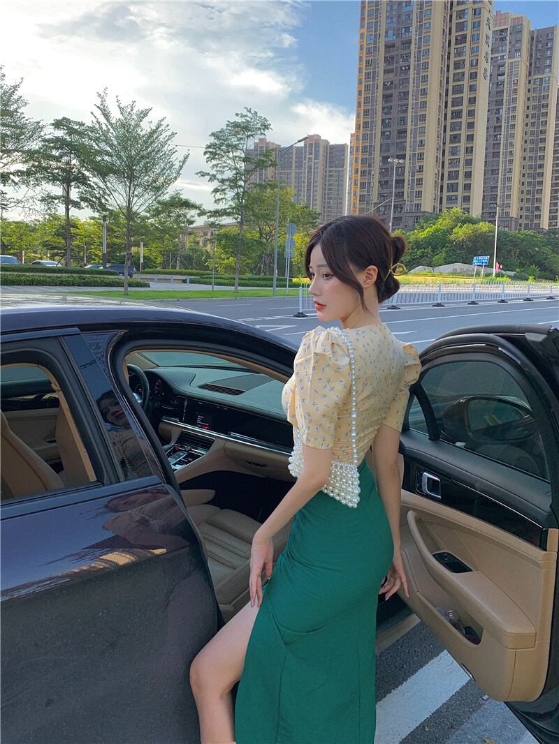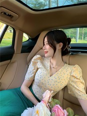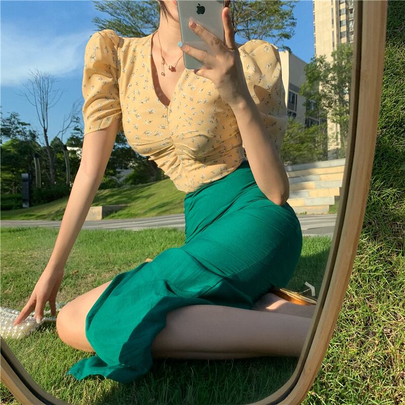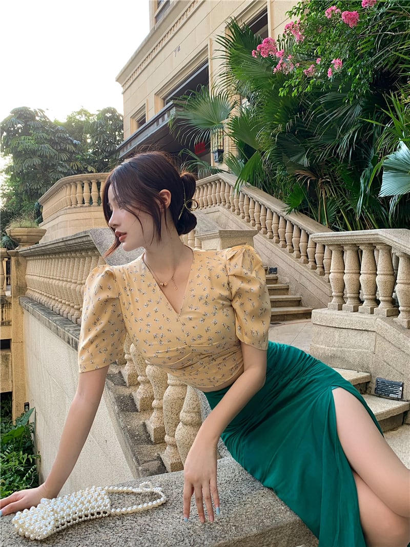 スタンダードフローラルスリーブVネックプリーツシャツ ハイウェストウェストスリットミディスカート レトロ 花柄 ウエスト GroundMODE299517390461 | pleglad Ground