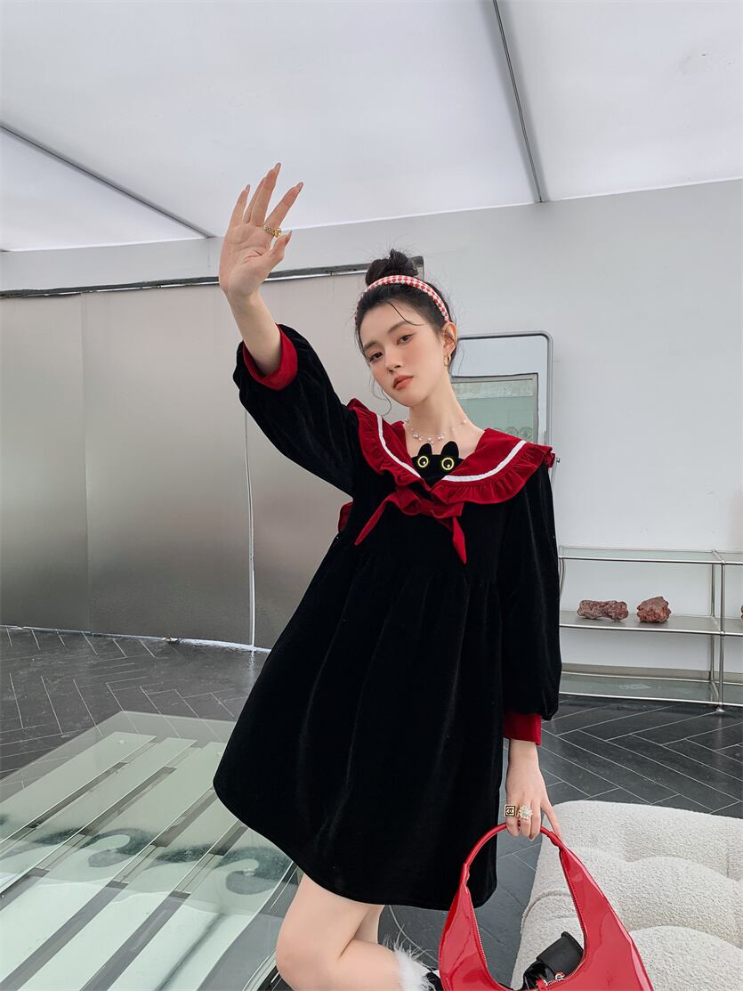 ブラック厚みワンピーススプリングリボンFlowerデザイン シャツ レッド 刺繍 大人ガーリー スウィート キュート カジュアル 春物 フラワーデザイン GroundMODE291544792674 | pleglad Ground