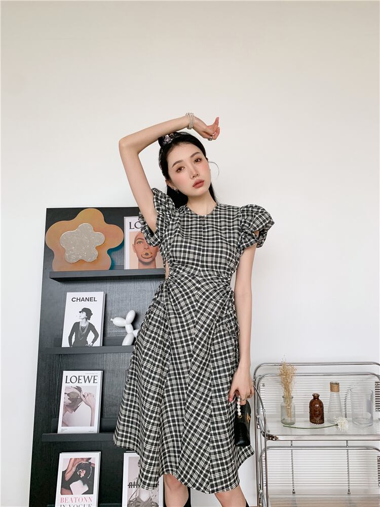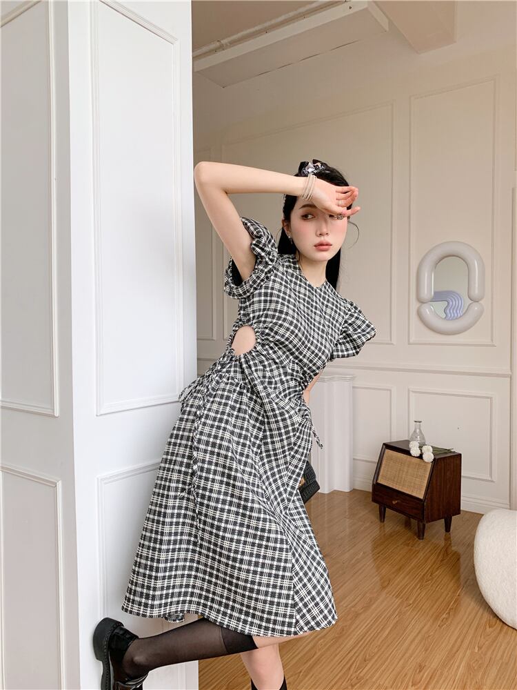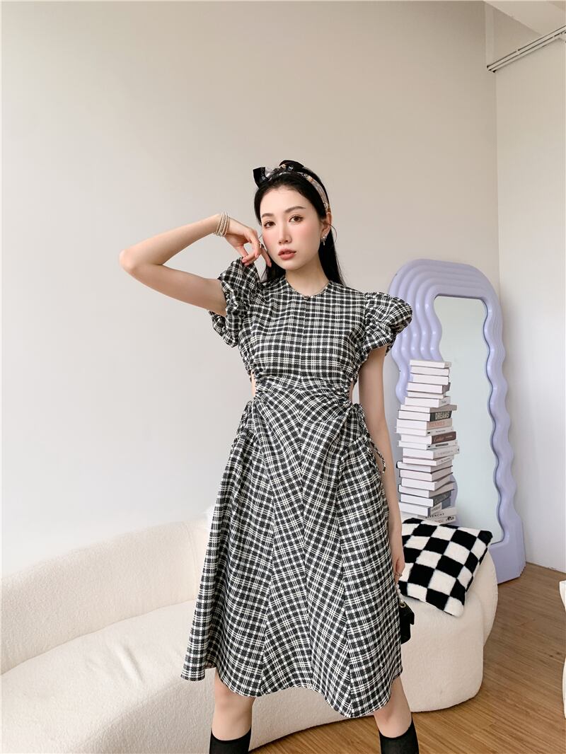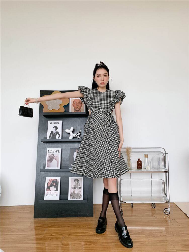 スタンダード半袖スリーブウェスト格子柄ワンピースロングスカート ショート レトロ ハーフスリーブ 大人ガーリー スウィート キュート カジュアル ウエスト GroundMODE231989549043 | pleglad Ground
