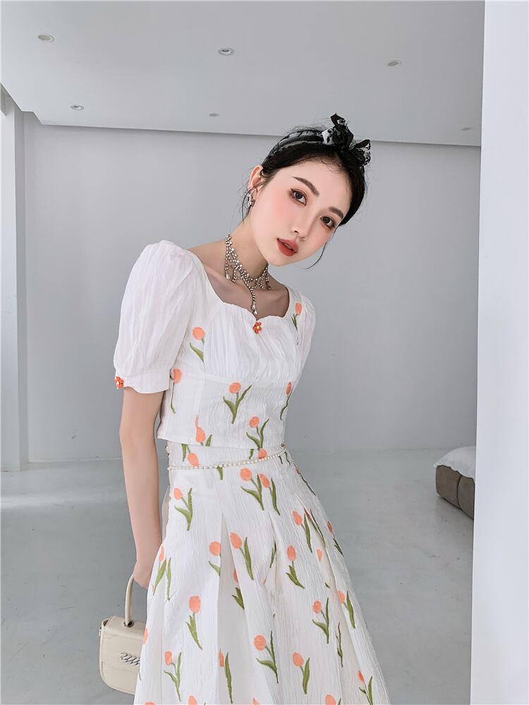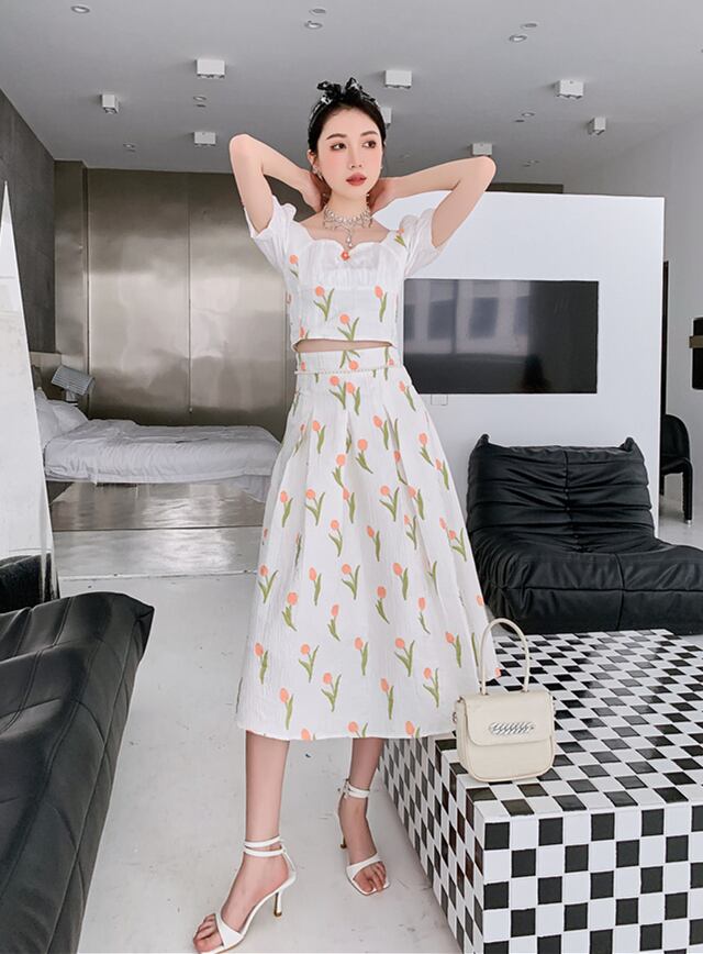 ジャカードトップス ウェストスカート ツーピース セット 大人ガーリー スウィート キュート カジュアル スクウェア ウエスト GroundMODE218510411821 | pleglad Ground