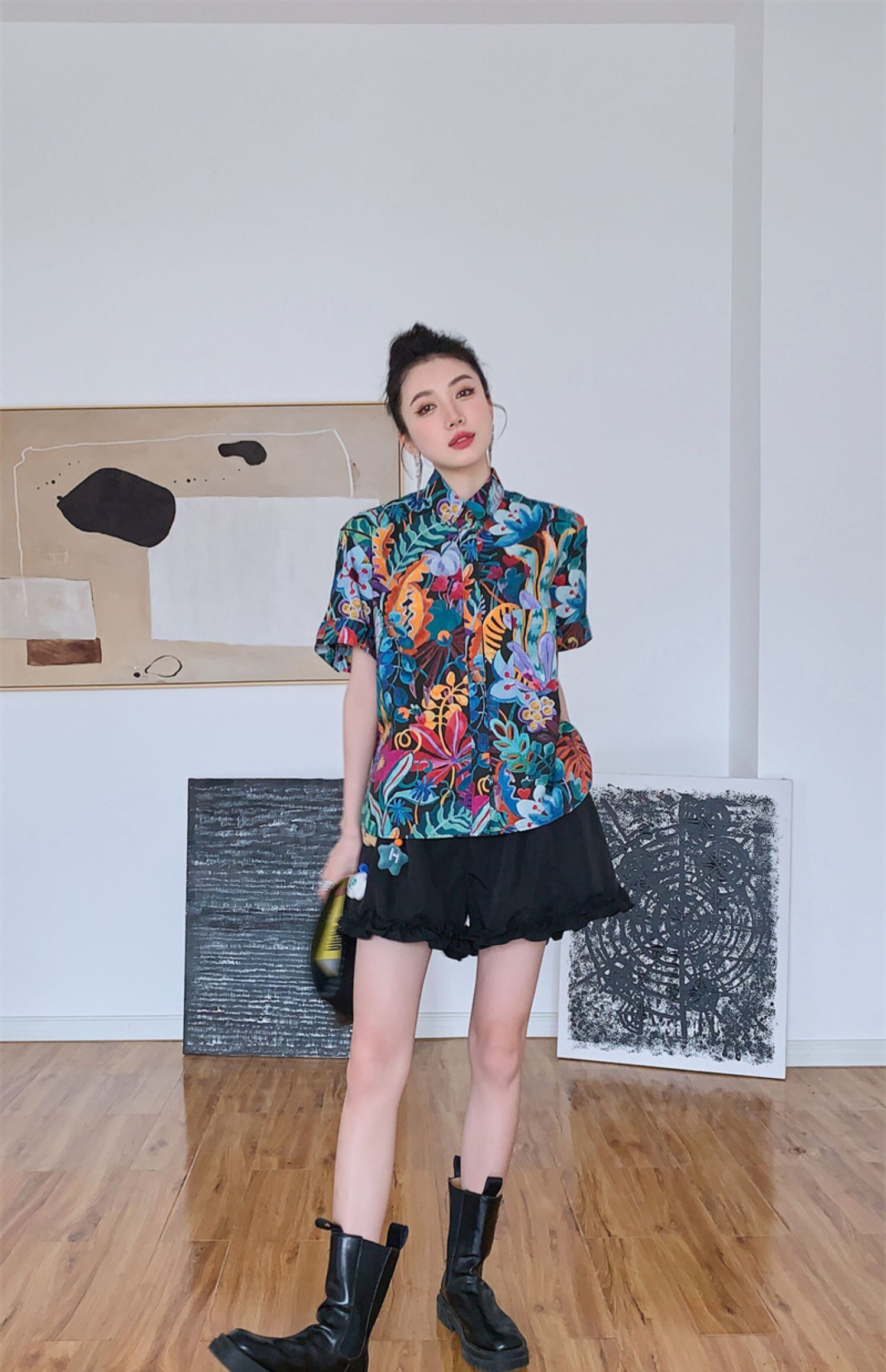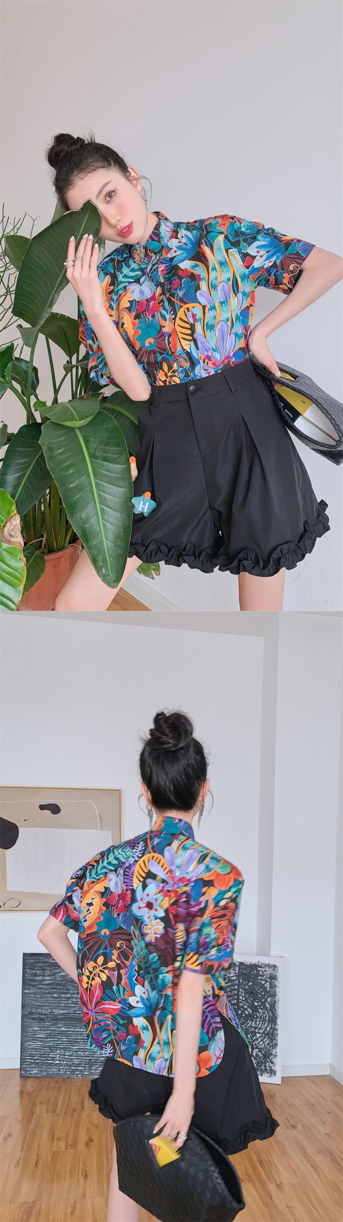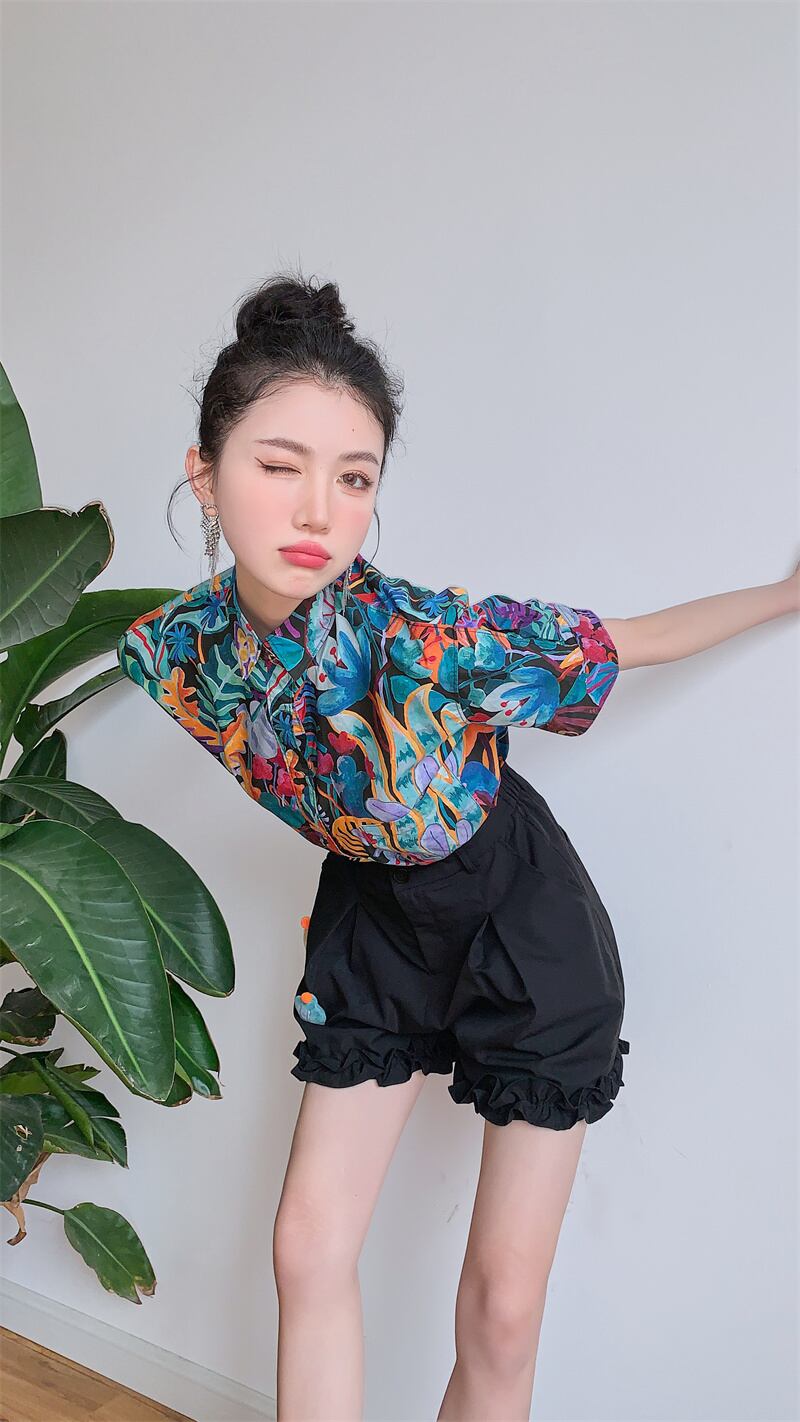 色:カラーシャツ,黒のショートパンツ