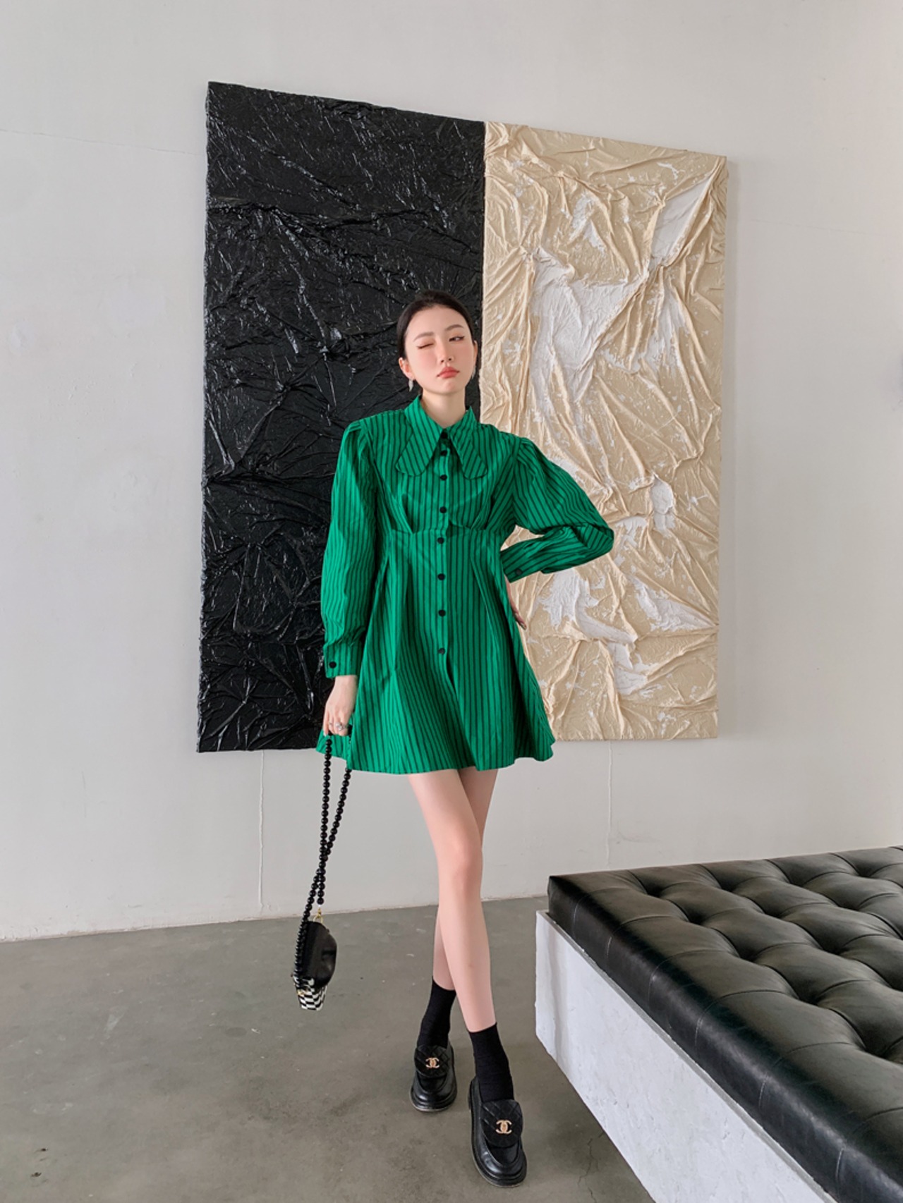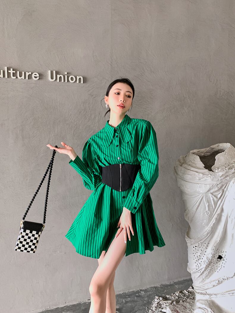 色:緑の縞模様のシャツドレス,コルセット付きグリーンストライプシャツドレス